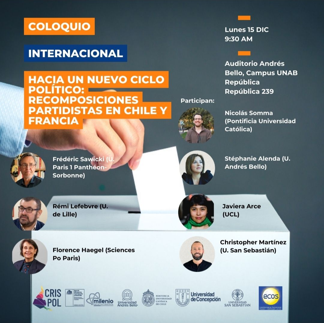 Este coloquio, organizado en el marco del programa Ecos-Anid y auspiciado por el Núcleo Milenio CRISPOL, cuenta con la participación de destacados especialistas de los partidos políticos en Francia: Frédéric Sawicki (Universidad de Paris 1 – Panthéon Sorbonne), co-director del proyecto Ecos-Anid “Recomposiciones partidistas y nuevas radicalidades: Perspectivas cruzadas entre Chile y Francia”; Rémi Lefebvre (Universidad de Lille) y Florence Haegel (Sciences Po).